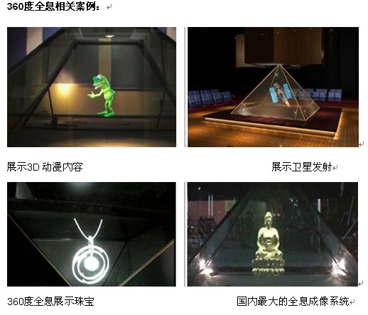 深圳時(shí)代中視科技發(fā)展有限公司  360全息幻影成像系統360全息也稱(chēng)360度全息和360度全息成像,我們在這里稱(chēng)它為360度全息成像。360全息成像也被稱(chēng)之為三維全息影像、全息三維成像,它是由透明材料制成的四面錐體,觀(guān)眾的視線(xiàn)能從任何一面穿透它,通過(guò)表面鏡射和反射,觀(guān)眾能從錐形空間里看到自由飄浮的影像和圖形。四個(gè)視頻發(fā)射器將光信號發(fā)射到這個(gè)錐體中的特殊棱鏡上,匯集到一起后形成具有真實(shí)維度空間的立體影像。